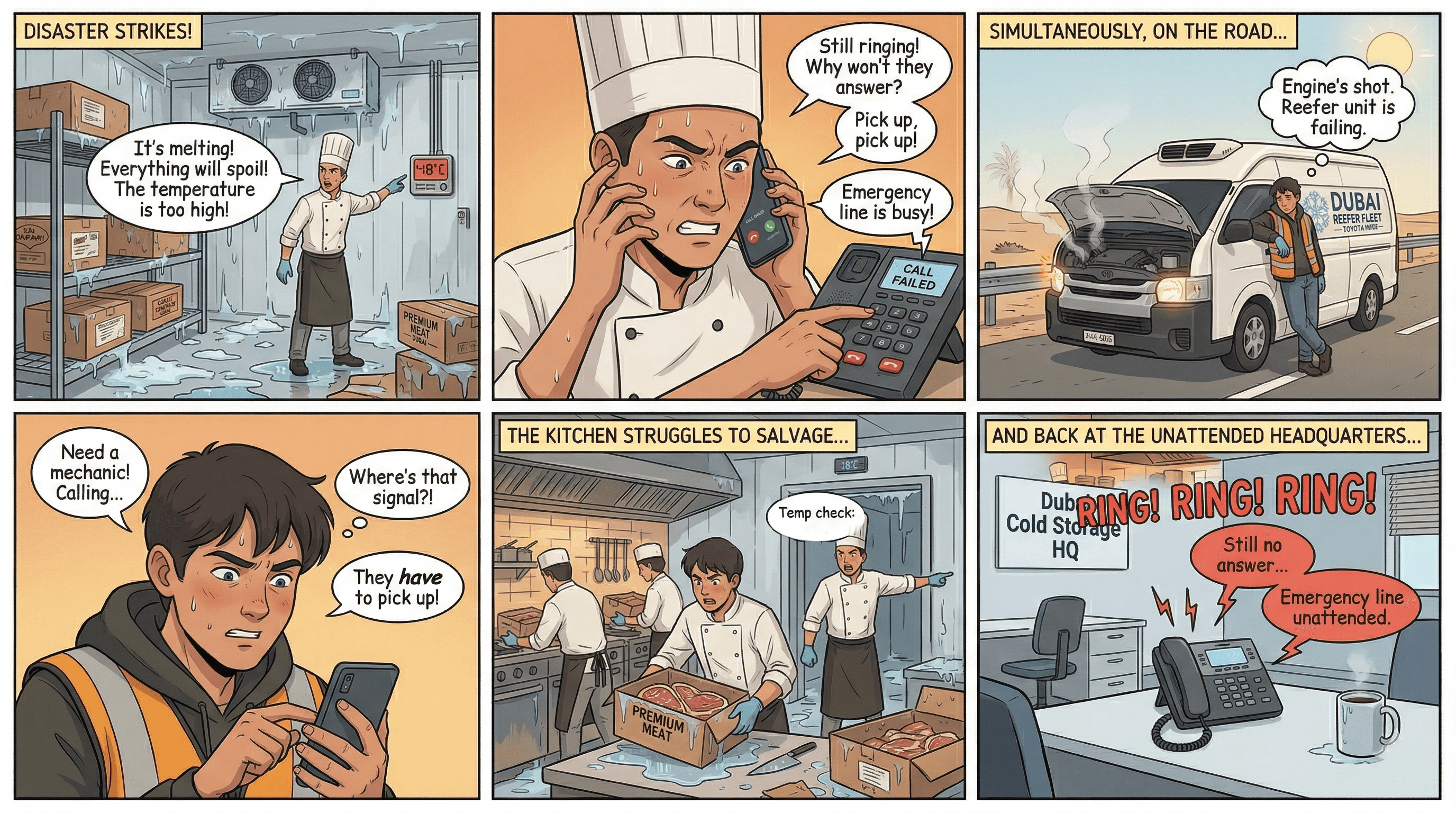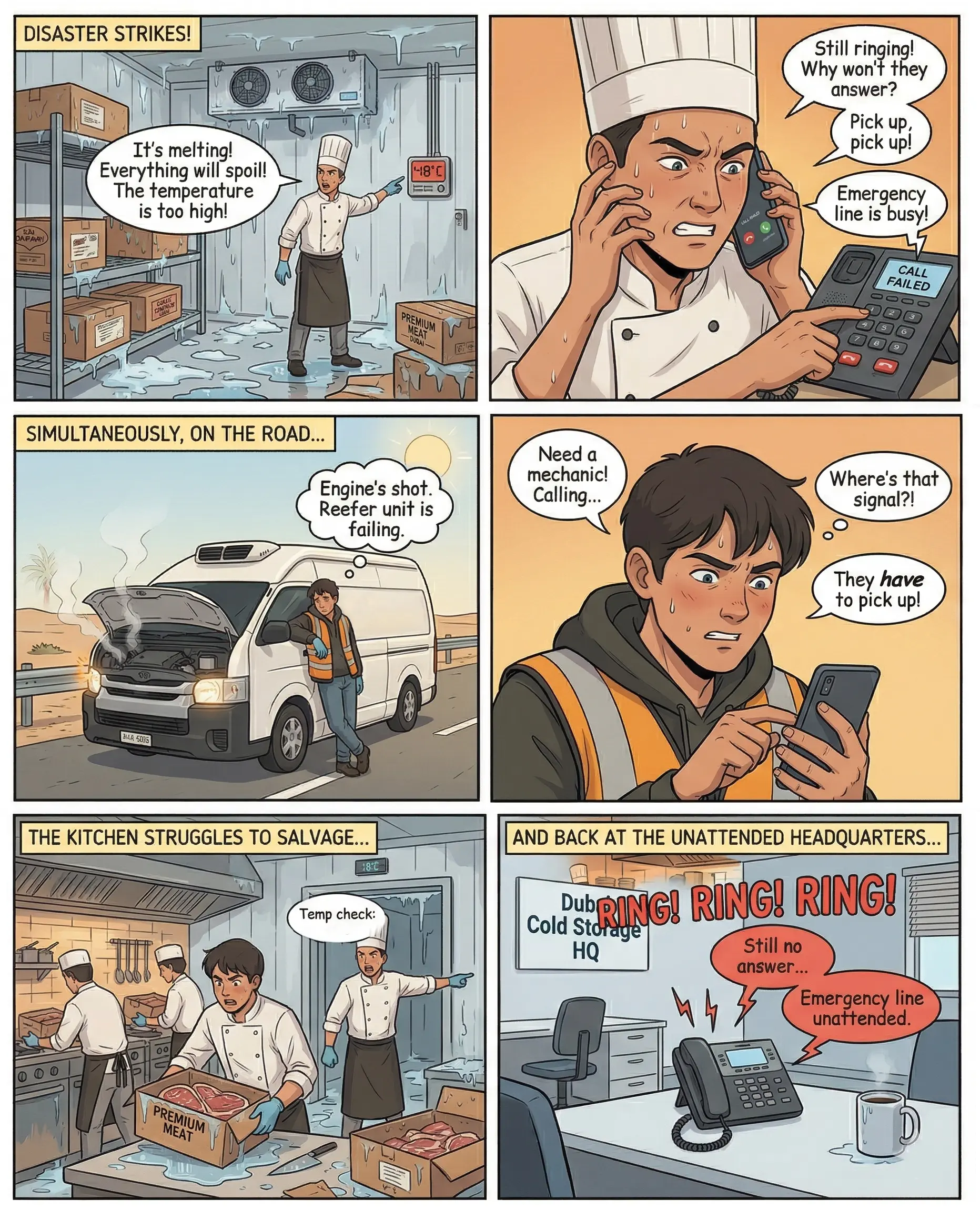 Breakdowns were reported on WhatsApp to personal contacts. No SLA, no ETA, no confirmation. Customers had no idea if help was coming or when.